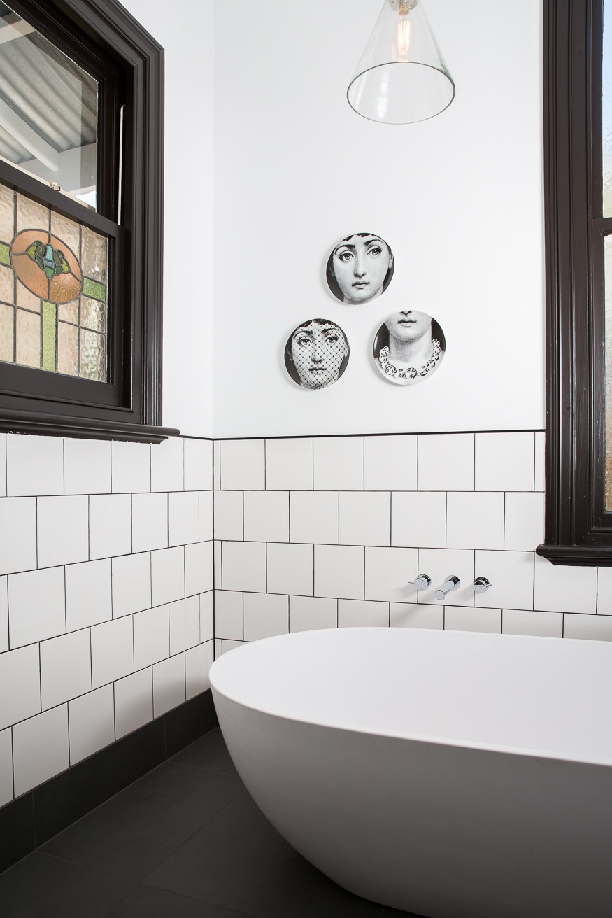 - Layout & features: A modern interpretation of a freestanding bath was chosen to replace the traditional claw-foot with the addition of more practical storage options. We also retained the heritage stained glass window and original doors, window frames and architraves.