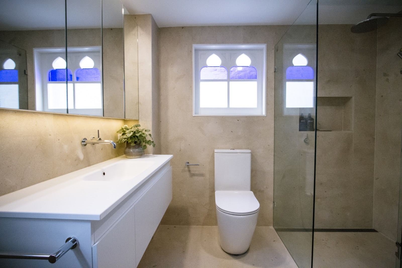 - Materials & details: Limestone is a material that can be applied in a modern or traditional way. Simple white joinery & chrome tapware allows the tiles & heritage features of the home to be the hero of this design. The simplicity allows the new bathroom to sit beautifully within the Victorian features.