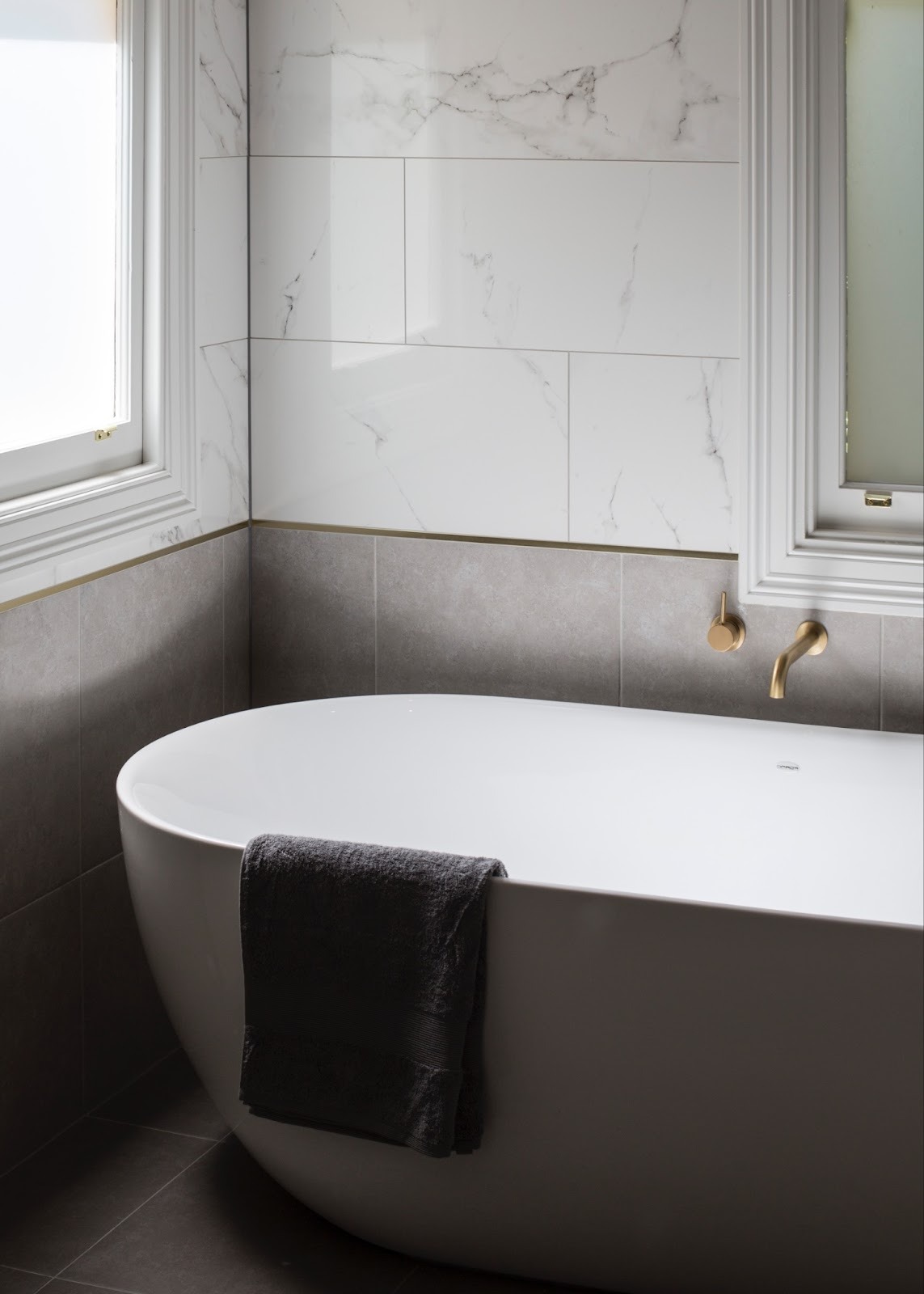 - Design approach: Marble-look tiles, warm greys, and brass fixtures were selected to balance modern elegance with period character. The finish complements the house’s warm whites and timber flooring to preserve warmth throughout.